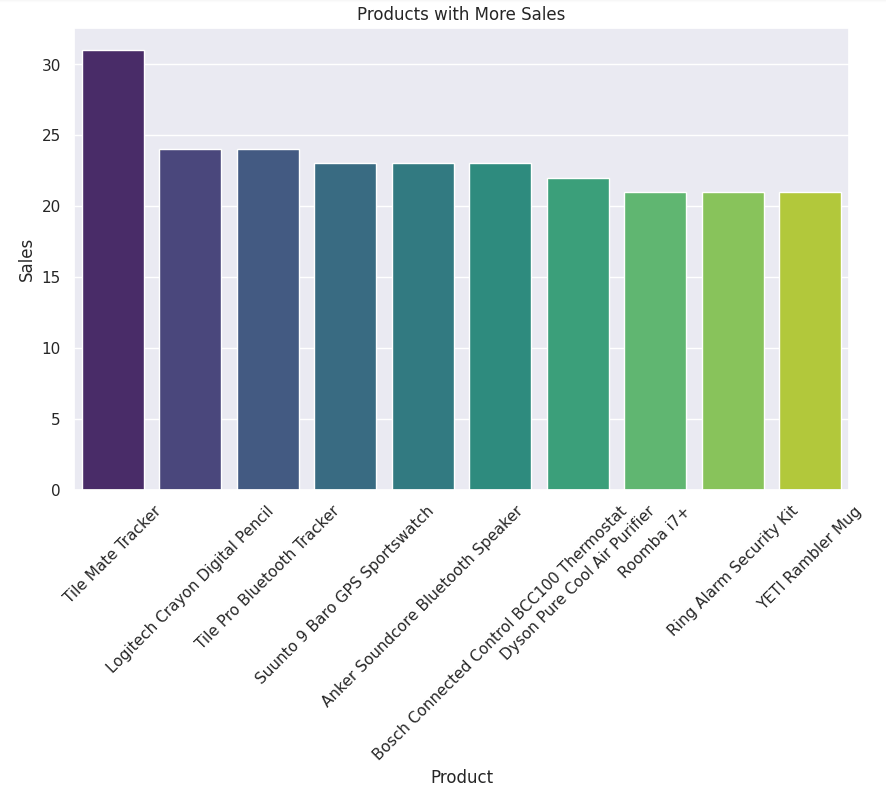 # Set the size of the plot figure (width, height) in inches plt.figure(figsize=(10, 6)) # Create the bar plot using Seaborn # data: the DataFrame containing the data to plot # x: the column name in the DataFrame to use for the x-axis # y: the column name in the DataFrame to use for the y-axis # hue: the column name to group data by different colors for each unique value # palette: the color palette to use for the bars sns.barplot( data=top10_products_with_more_sales, x='Product', y='total', hue='Product', palette='viridis' ) # Set the x-axis label to 'Product' plt.xlabel('Product') # Set the y-axis label to 'Sales' plt.ylabel('Sales') # Set the title of the plot plt.title('Products with More Sales') # Rotate the x-axis labels by 45 degrees for better readability plt.xticks(rotation=45) # Display the plot on the screen plt.show()
