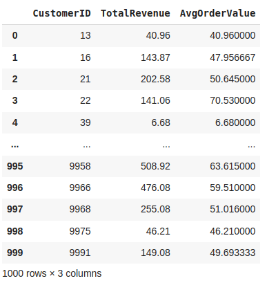 The resulting customer_lifetime_value_df DataFrame gives a comprehensive view of each customer's total revenue and the average order value, which can be useful for further analysis or reporting.
