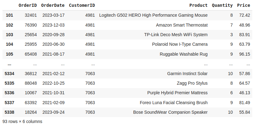 # Filter the DataFrame `orders_df` to include only the rows where the 'CustomerID' # is present in the list `top10_customers_by_total_expenses`. # The .isin() method checks if each 'CustomerID' in `orders_df` exists # within the `top10_customers_by_total_expenses` list and returns a boolean Series. orders_from_top10_customers_by_total_expenses_df = orders_df[orders_df['CustomerID'].isin(top10_customers_by_total_expenses)] # Display the resulting DataFrame which contains orders from the top 10 customers # based on their total expenses. orders_from_top10_customers_by_total_expenses_df