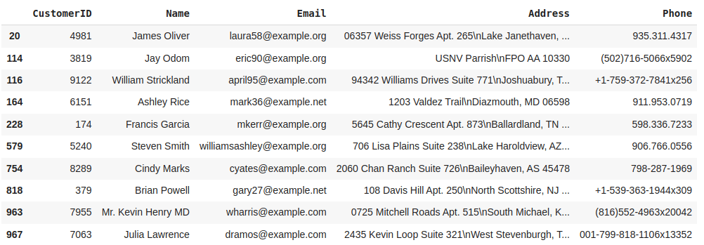 # Group by 'CustomerID' and sum the 'Total' expenses for each customer total_expenses_df = merged_df.groupby('CustomerID')['Total'].sum().reset_index() # Sort the resulting DataFrame based on the 'Total' expenses in descending order total_expenses_df = total_expenses_df.sort_values(by=['Total'], ascending=False) # Select the top 10 customers based on their total expenses top10_customers_by_total_expenses = total_expenses_df[0:10]['CustomerID'] # Filter the original customers DataFrame to include only the top 10 customers by total expenses top10_customers_by_total_expenses_df = customers_df[customers_df['CustomerID'].isin(top10_customers_by_total_expenses)] # Display the DataFrame containing information of the top 10 customers by total expenses top10_customers_by_total_expenses_df