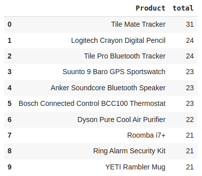 # Group the merged DataFrame by the 'Product' column and aggregate data. # Create a new column 'count_col' which counts the number of occurrences of each product. product_revenue_df = merged_df.groupby('Product').agg( total=pd.NamedAgg(column="Product", aggfunc="count") ).sort_values(by=['total'], ascending=False).reset_index() # Select the top 10 products with the most sales based on the count_col. top10_products_with_more_sales = product_revenue_df[0:10] # Output the result: a DataFrame containing the top 10 products by sales count. top10_products_with_more_sales
