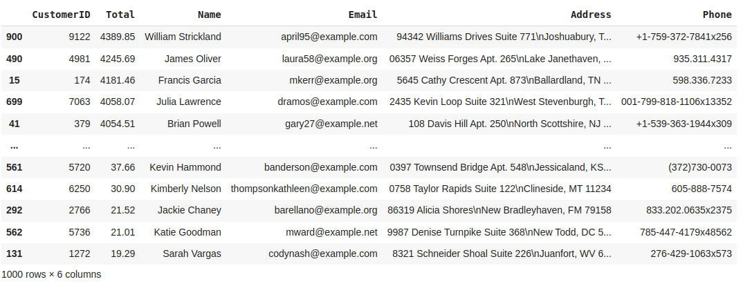 # Group the merged DataFrame by 'CustomerID' and calculate the sum of the 'Total' column for each customer # The result is a new DataFrame with 'CustomerID' and their respective total revenue customer_revenue = merged_df.groupby('CustomerID')['Total'].sum().reset_index() # Merge the customer revenue summary DataFrame with the original customers DataFrame # This brings additional customer details (e.g., name, contact info) into the resulting DataFrame # The merge is performed on the 'CustomerID' column; 'how='inner'' ensures only customers present in both DataFrames are included customer_revenue_df = pd.merge(customer_revenue, customers_df, on='CustomerID', how='inner') # Sort the combined DataFrame by the 'Total' column in descending order # This means the customers with the highest revenue will be at the top of the DataFrame customer_revenue_df.sort_values(by=['Total'], ascending=False)
